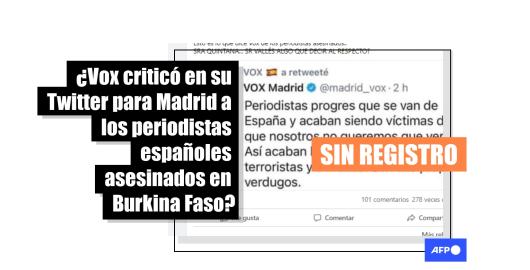 Imagen Publicado el 30/04/2021 No hay registro de un tuit de Vox contra los periodistas españoles asesinados en Burkina Faso