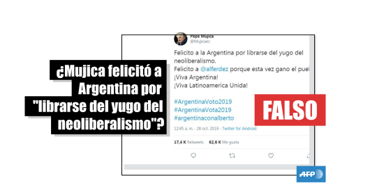 Imagen Publicado el 29/10/2019 Es falso que el expresidente uruguayo José Mujica felicitó a Argentina “por librarse del yugo del neoliberalismo”
