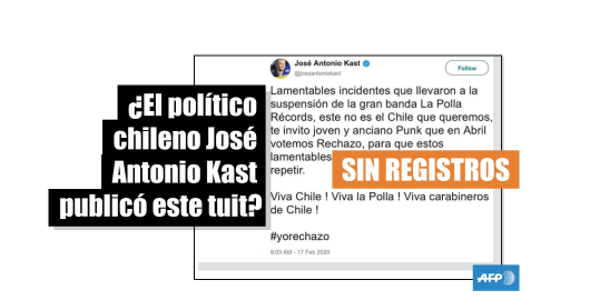 Imagen Publicado el 18/02/2020 No hay registros de que el excandidato presidencial Kast haya tuiteado sobre un concierto de La Polla Records en Chile