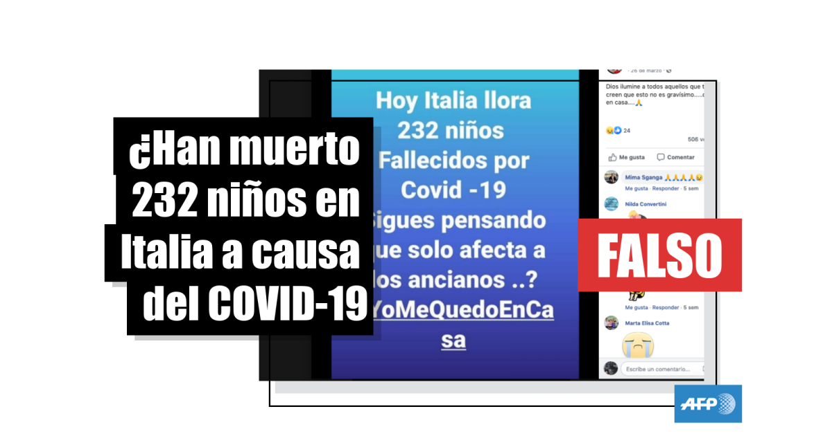 “Hoy Italia llora 232 niños Fallecidos por Covid - 19 Sigues pensando que solo afecta a ancianos..? [sic]”, dice una publicación compartida más de 42.000 veces en Facebook (1, 2, 3, 4) desde el 24 de marzo. La misma afirmación también circuló en Twitter (1, 2, 3).