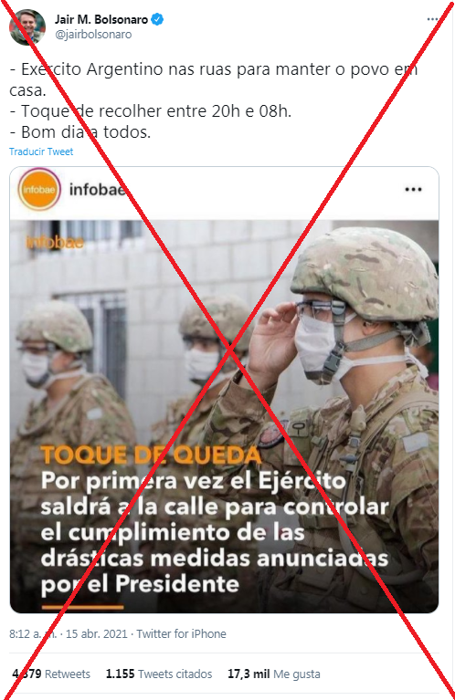 “Ejército argentino en las calles para mantener a la gente en casa. Toque de queda entre las 20.00 y las 8.00 horas”, tuiteó Bolsonaro y añadió una publicación del portal argentino Infobae en Instagram que dice: “Toque de queda. Por primera vez el Ejército saldrá a la calle para controlar el cumplimiento de las drásticas medidas anunciadas por el Presidente”.
