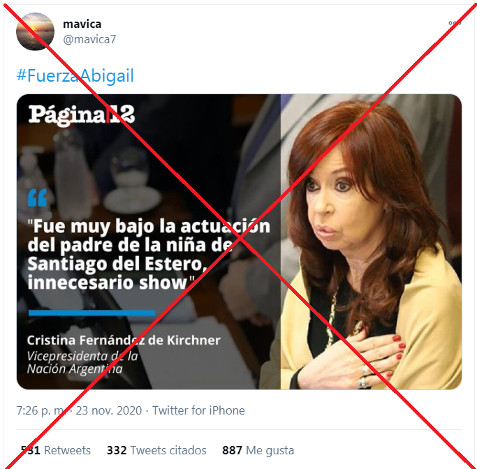 Otro meme muy similar, que también circula en Facebook y Twitter (1 y 2), atribuye una frase a Cristina Kirchner: “Fue muy bajo la actuación del padre de la niña de Santiago del Estero, innecesario show”.