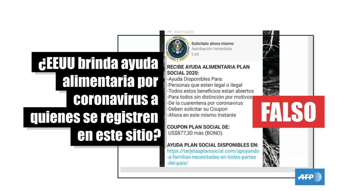 “RECIBE AYUDA ALIMENTARIA PLAN SOCIAL 2020: Ayuda disponibles para personas que esten legal o ilegal. Todos estos beneficios estan abiertos para todos sin distinción por motivos de la cuarentena por coronavirus. Deben solicitar su coupon ahora en este mismo Instante [sic]”, señala un mensaje con un enlace y el logo de la Presidencia de Estados Unidos que circula por WhatsApp y que fue recibido por AFP Factual.