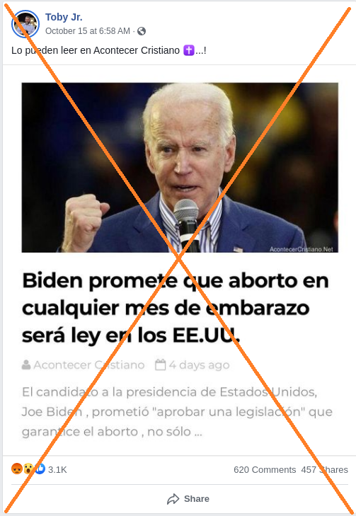 “Biden promete aborto en cualquier mes de embarazo y hacerlo ley”, dice el título de una publicación en un sitio web de información cristiana, que ha sido compartido en Facebook al menos 2.800 veces, según la herramienta de monitoreo CrowdTangle.