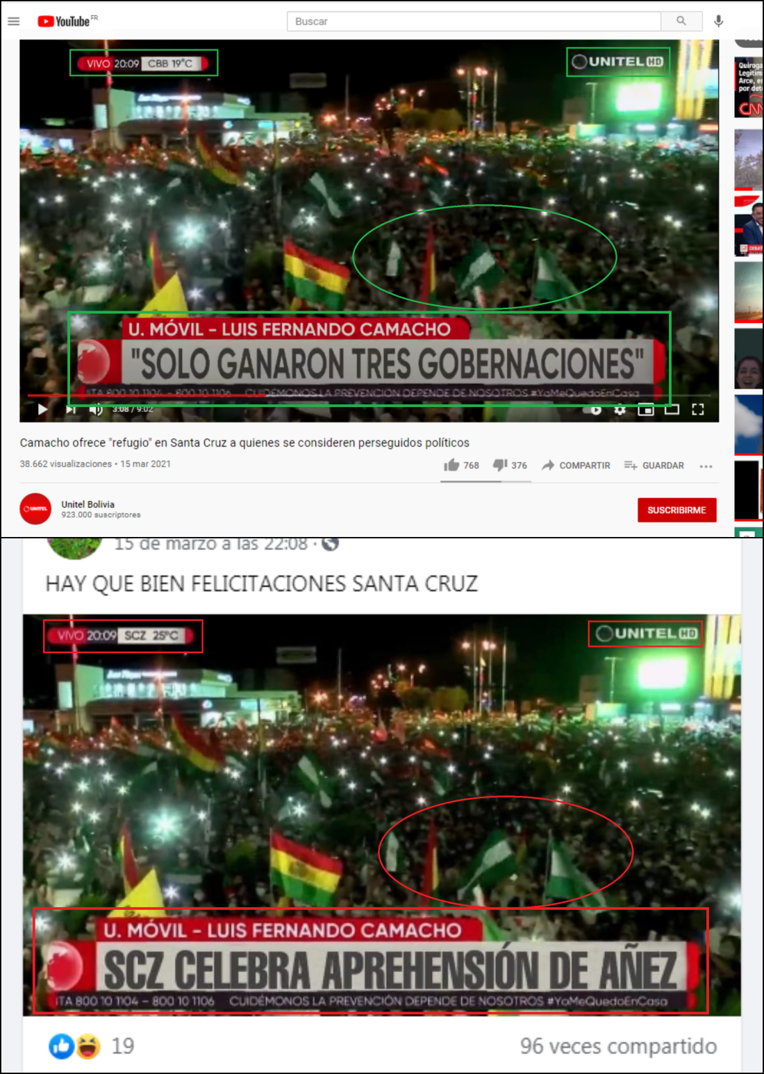 Una búsqueda por “Santa Cruz” en el canal de YouTube de Unitel permitió llegar a este video del 15 de marzo que registra un discurso de Luis Fernando Camacho, gobernador electo de la ciudad. En el minuto 3:08, se puede ver la misma captura de las banderas flameando pero con los textos originales en el zócalo de la pantalla: