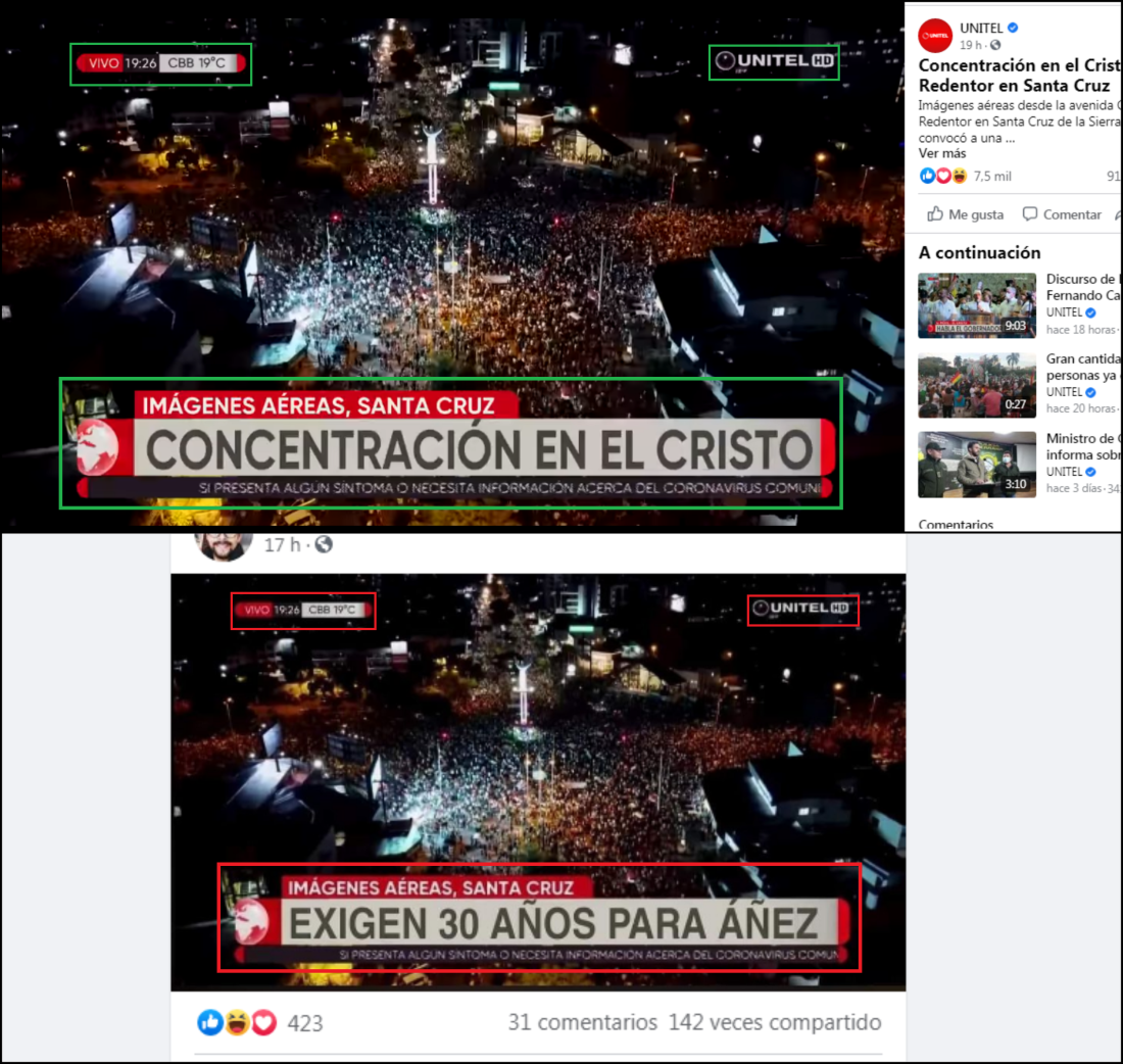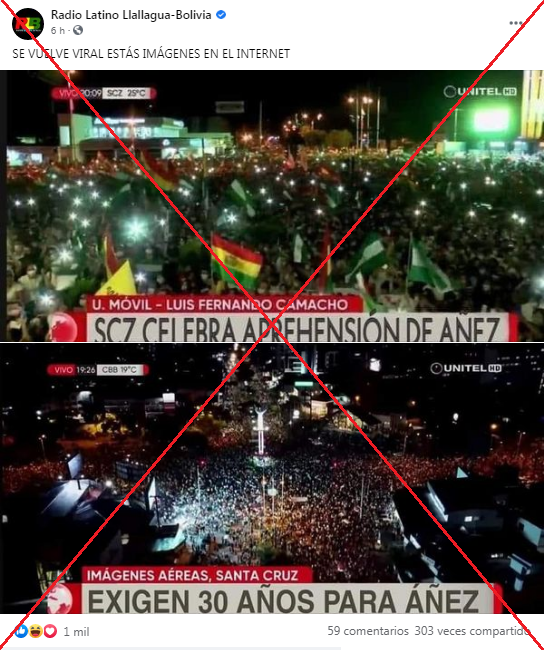 “EXIGEN 30 AÑOS PARA ÁÑEZ”, dice el supuesto titular de Unitel mostrando una toma aérea de la ciudad boliviana de Santa Cruz, con miles de personas congregadas alrededor del Monumento Cristo Redentor. La segunda imagen, en la que se ve a una multitud con banderas y luces, dice “SCZ [Santa Cruz] CELEBRA APREHENSIÓN DE AÑEZ”, también con el estilo de los gráficos de Unitel (1, 2, 3).