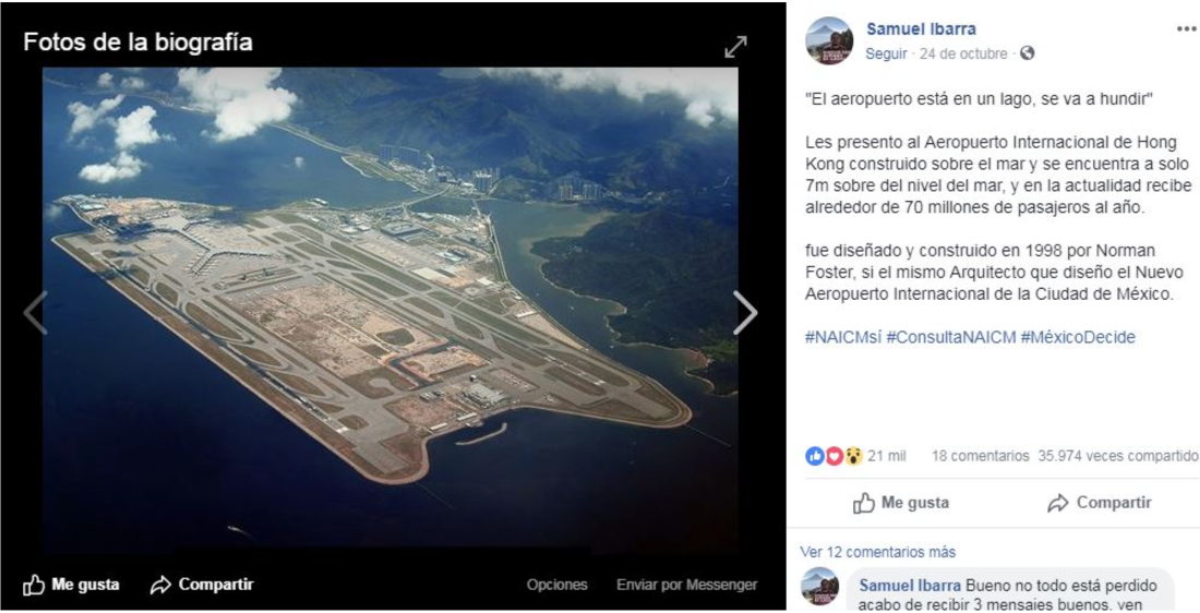 La publicación de Facebook también acierta al decir que el arquitecto británico diseñó el que sería el nuevo aeropuerto mexicano. En el portal de Foster and Partners además de imágenes e información sobre el aeropuerto de Hong Kong, también figura el proyecto del llamado Nuevo Aeropuerto Internacional de la Ciudad de México (NAICM), cuya construcción estaba prevista en Texcoco.