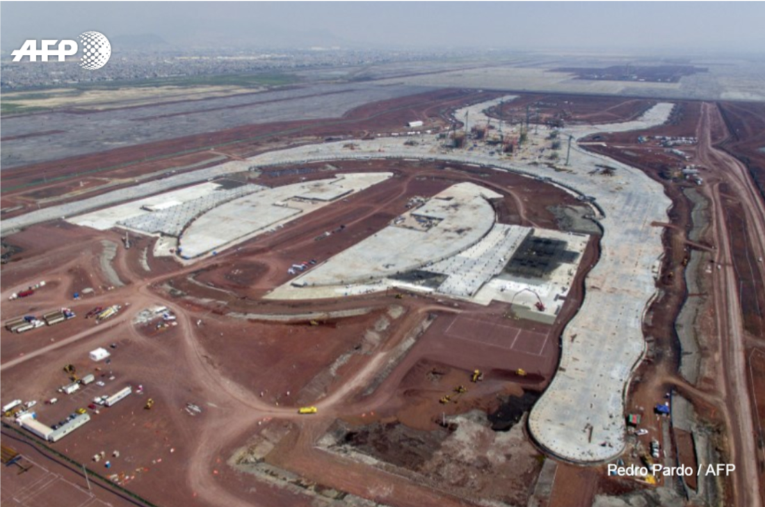 La siguiente vista aérea fue tomada el 21 de julio de 2018 por el fotógrafo de la AFP Pedro Pardo y muestra que la estructura prevista en el proyecto inicial ya había empezado a tomar forma en Texcoco.