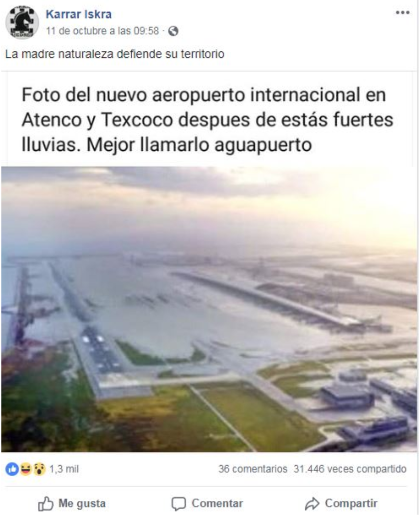 A principios de octubre otra publicación se volvió viral. El contenido -una fotografía y un texto- asegura que muestra “el nuevo aeropuerto internacional en Atenco y Texcoco después de estas fuertes lluvias. Mejor llamarlo aguapuerto”.