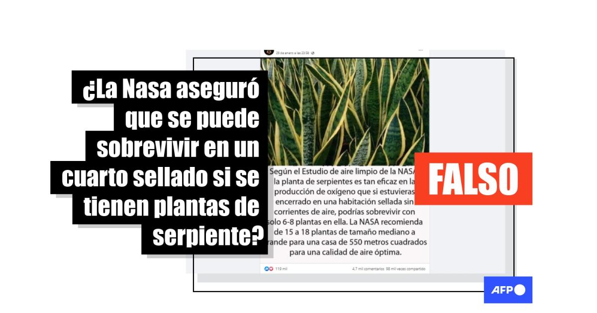 “Según el Estudio de aire limpio de la NASA la planta de serpientes es tan eficaz en la producción de oxígeno que si estuvieras encerrado en una habitación sellada sin corrientes de aire podrías sobrevivir con solo 6-8 plantas en ella”, se lee en el meme, que circula en Facebook (1, 2, 3), Instagram (1, 2) y Twitter (1, 2).