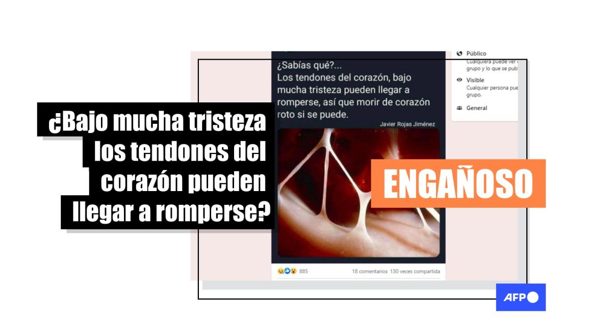 “Los tendones del corazón bajo mucha tristeza pueden llegar a romperse, así que morir de corazón roto sí se puede”, aseguran publicaciones en Facebook (1, 2) y Twitter (1, 2, 3) junto a una imagen de lo que serían “tendones del corazón”, que circulan al menos desde 2015.