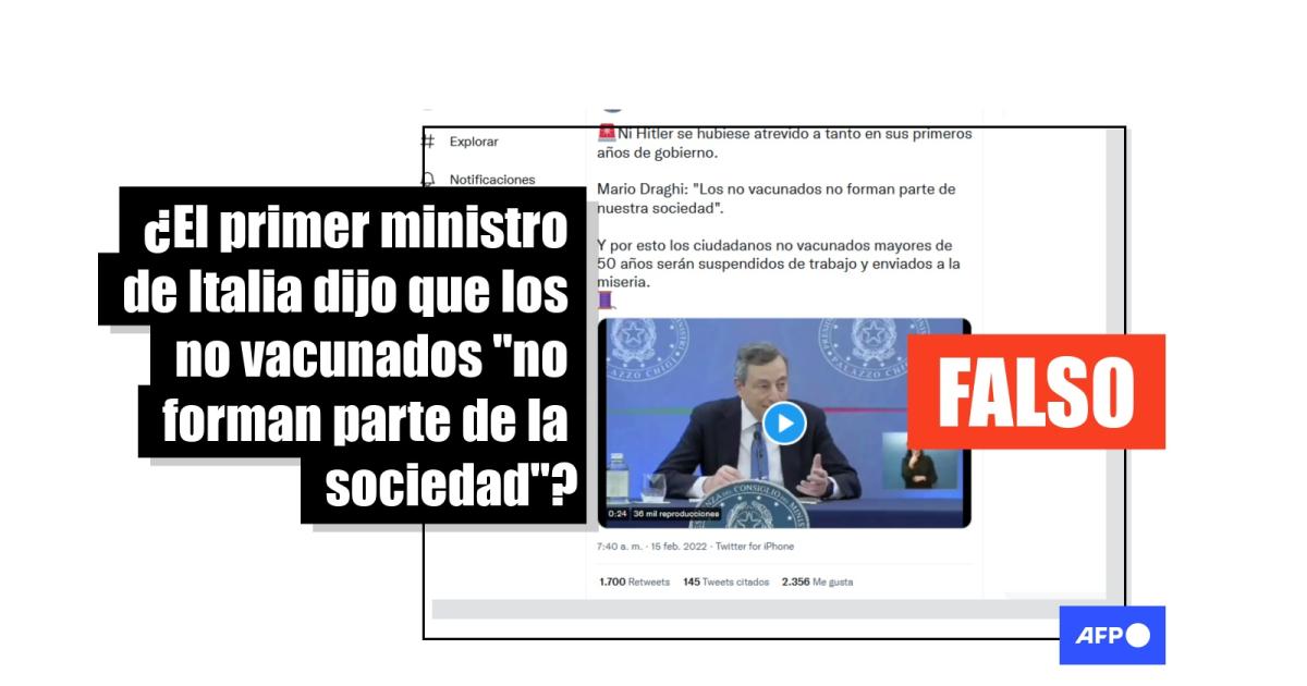 “Ni Hitler se hubiese atrevido a tanto en sus primeros años de gobierno. Mario Draghi: ‘Los no vacunados no forman parte de nuestra sociedad’”, se lee en un tuit que incluye un video donde el primer ministro habla por 14 segundos. La secuencia no incluye subtítulos.