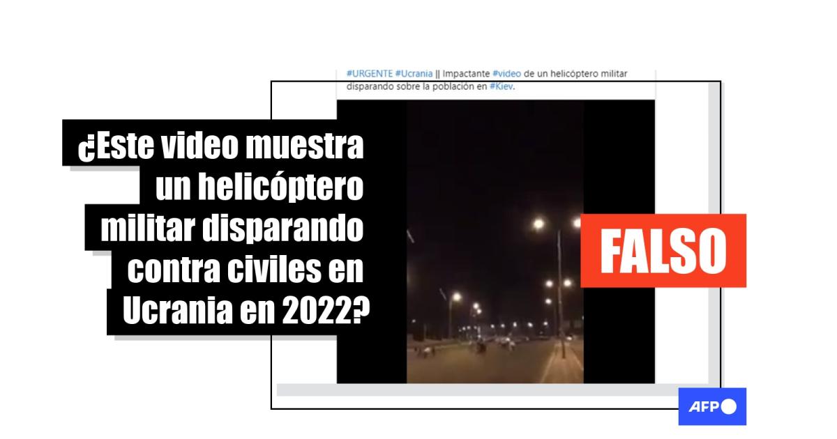 “Impactante video de un helicóptero militar disparando sobre la población en Kiev”, dicen publicaciones en Facebook (1, 2) y Twitter (1) junto a la grabación. Algunas entradas en esas redes sociales (1, 2) e Instagram (1) añaden que el ataque fue hecho por un “helicóptero militar ruso”.