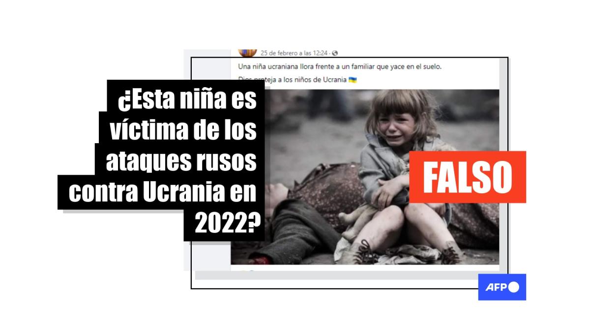 “Una niña ucraniana llora frente a un familiar que yace en el suelo. Dios proteja a los niños de Ucrania”, dice una publicación con la imagen en Facebook (1, 2, 3).