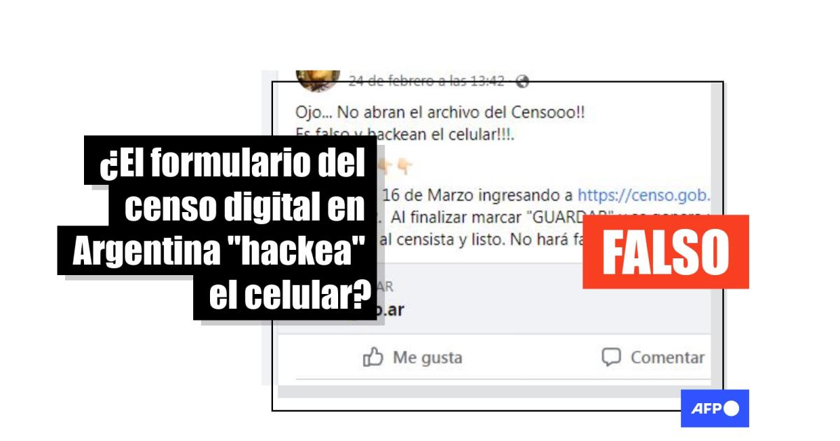 “Es falso y hackean el celular !!! OjO .... No Abran si les mandan el archivo del Censo, un formulario para completar !!!! Es falso y hackean el celular!!!”, se lee en publicaciones en Facebook (1, 2) y Twitter. El mensaje también circula en WhatsApp. Algunas publicaciones también advierten contra un “hackeo” desde la página web del censo e incluyen el enlace al sitio oficial. Otras agregan: “Le pasó a una amiga!!!!”.