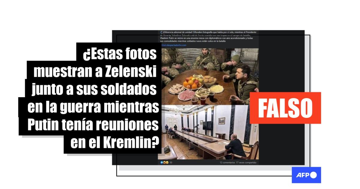 “¡Diferencia abismal de unidad! Difunden fotografía que habla por sí sola, mientras el Presidente de Ucrania, Volodimir Zelenski está de frente reunido con sus tropas en el campo de batalla; Vladimir Putin se reúne en una enorme mesa con diplomáticos con aire acondicionado y todas sus comodidades mientras soldados rusos están solos en la batalla”, señala una publicación en Facebook con las imágenes. En la misma red social, circulan mensajes similares (1, 2).