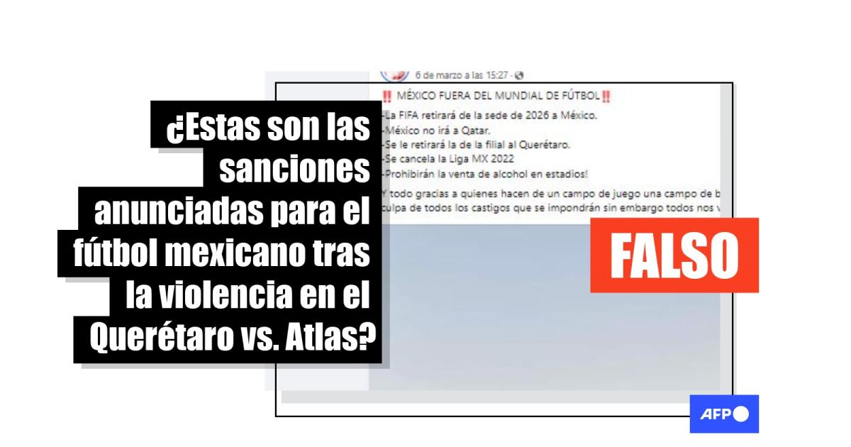 Según el texto que circula en Facebook (1, 2), México quedará “fuera del Mundial de Fútbol” de Catar-2022 y tampoco podrá organizar el torneo de 2026, por decisión de la FIFA. La “Liga MX 2022” será cancelada y en los estadios no se podrá vender alcohol. Además, al club Querétaro se le retirará la filial, es decir, el registro como equipo.