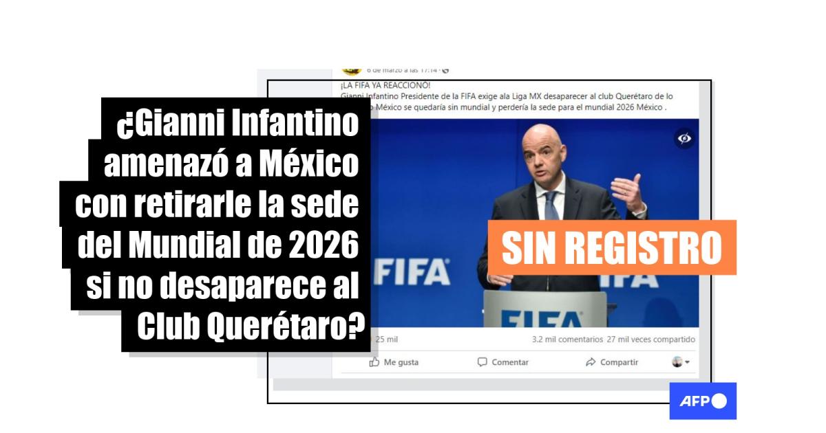 “¡LA FIFA YA REACCIONÓ! Gianni Infantino Presidente de la FIFA exige ala Liga MX desaparecer al club Querétaro de lo contrario México se quedaría sin mundial y perdería la sede para el mundial 2026 México”, dicen las publicaciones en Facebook (1, 2, 3), Instagram (1) y Twitter (1, 2, 3).