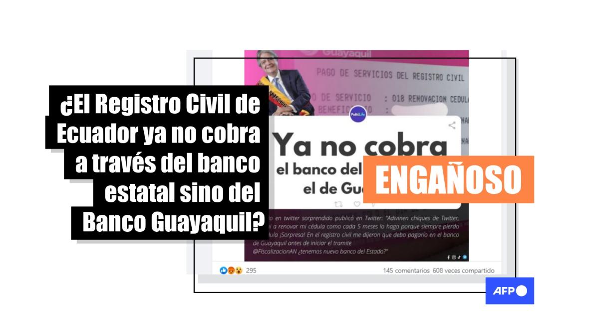 La publicación hace eco de un tuit del 22 de febrero, en el que un usuario cuenta que tuvo que pagar en el Banco Guayaquil al renovar su cédula en el Registro Civil. Las capturas de pantalla de ese tuit se han compartido más de 1.000 veces en Facebook (1, 2).