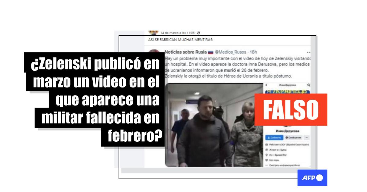 “El presidente de Ucrania, Volodímir Zelensky, publica un viejo video y alega haberlo grabado hoy. La médica militar Inna Derosova, fallecida el 26 de febrero, aparece en el video publicado hoy, y sus familiares confirmaron su muerte, y el propio Zelensky le otorgó el título de Héroe de Ucrania tras su muerte”, aseguran publicaciones en Facebook (1, 2, 3) y Twitter (1, 2, 3).