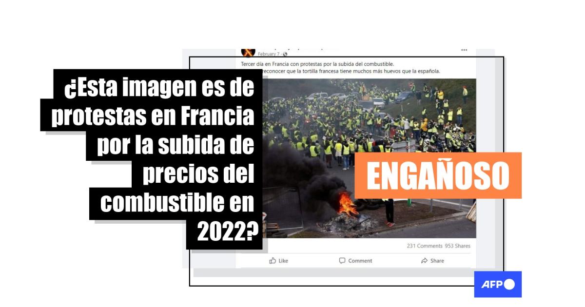 “Tercer día en Francia con protestas por la subida del combustible”, dicen las entradas compartidas en febrero y marzo de 2022, adjuntando una fotografía en la que se ve a manifestantes con chalecos amarillos reflectantes, uno de los cuales alimenta una hoguera de neumáticos ardiendo. Fotografía y mensaje también circulan en Twitter.