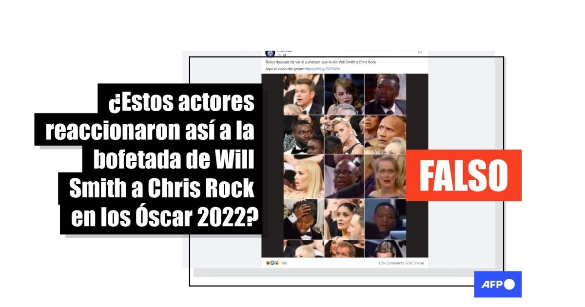 “Todos después de ver el puñetazo que le dio Will Smith a Chris Rock”, asegura esta entrada, “Will Smith golpeo a Chris Rock en la cara y esta fue la reacción de algunos actores presentes en los premios Oscar”, expresa esta otra. La combinación de 15 imágenes de actores también fue compartida en Twitter y circuló en inglés, portugués y holandés.