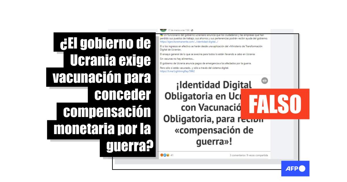 “¡Identidad Digital Obligatoria en Ucrania, con Vacunación Obligatoria, para recibir ‘compensación de guerra’!”, señalan publicaciones en Twitter (1, 2) y en Facebook (1, 2). Contenidos similares también han sido difundidos en sitios web.
