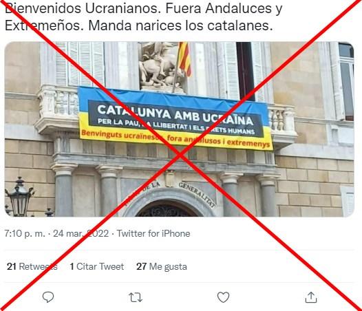 “Los políticos de Cataluña cuelgan pancartas dando la bienvenida a los exiliados de Ucrania. Peeeeero… dicen ‘fuera extremeños y andaluces’”, reproduce una de las publicaciones que difunden la imagen de la pancarta. La misma fotografía circula en Facebook (1, 2) y Twitter (1, 2).