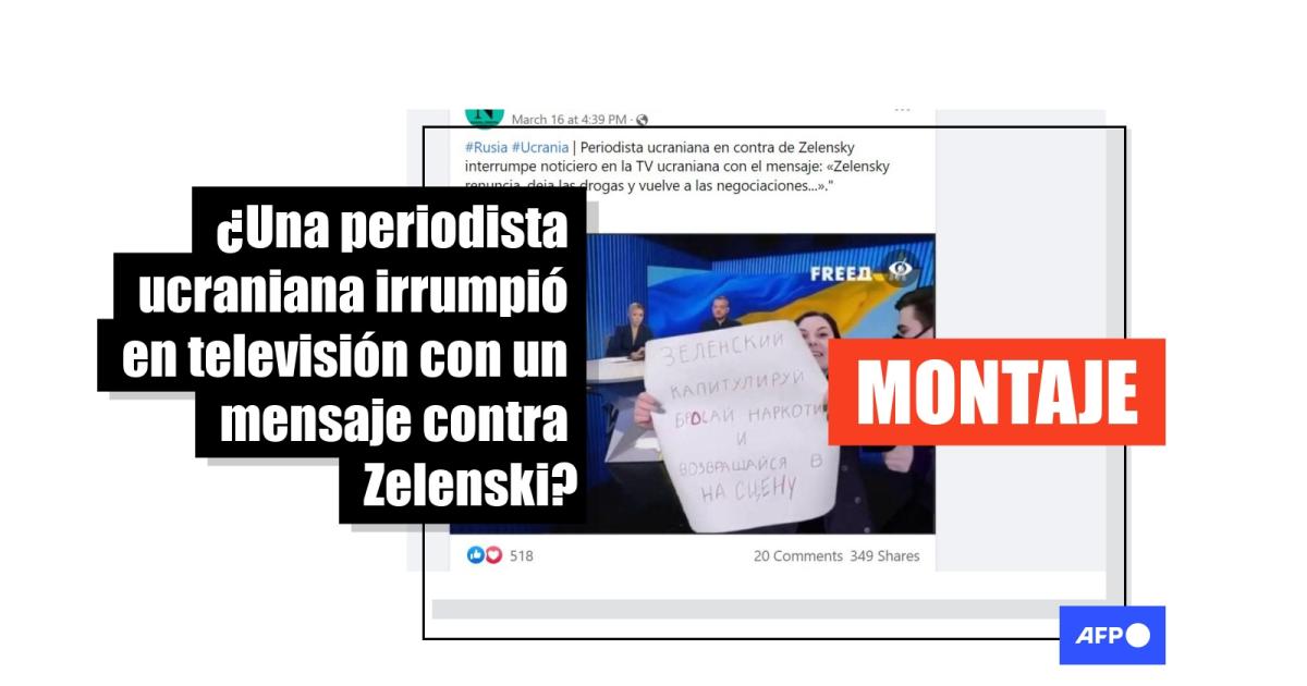 “Periodista ucraniana en contra de Zelensky interrumpe noticiero en la TV ucraniana con el mensaje: ‘Zelensky renuncia, deja las drogas y vuelve a las negociaciones…’", dice esta publicación. La fotografía de la presunta periodista con el cartel fue publicada también en Twitter y en esta página.