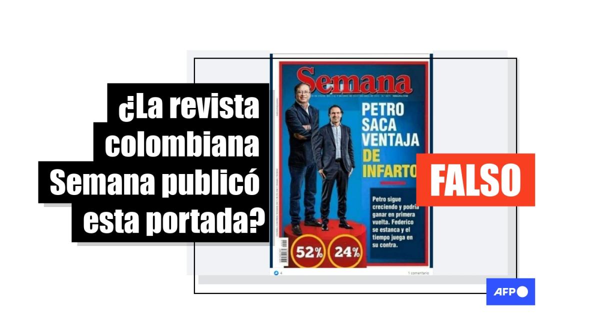 “Petro saca ventaja de infarto. Petro sigue creciendo y podría ganar en primera vuelta. Federico se estanca y el tiempo juega en su contra”, se lee en la supuesta tapa difundida en Facebook (1, 2, 3), Twitter (1, 2) e Instagram.