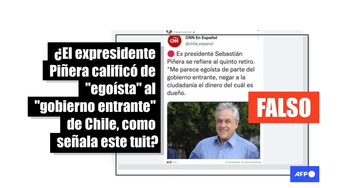 “Ex presidente Sebastián Piñera se refiere al quinto retiro. ‘Me parece egoísta de parte del gobierno entrante, negar a la ciudadanía el dinero del cuál es dueño’”, señalan publicaciones en Facebook (1, 2) que comparten la imagen.