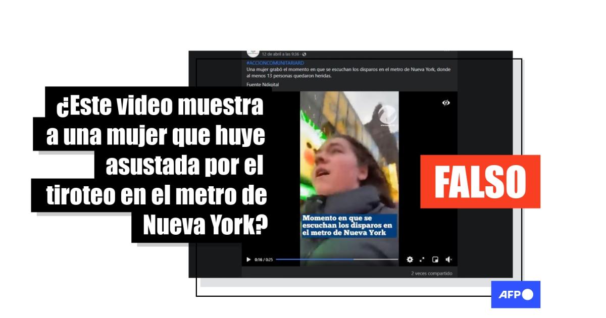 “Una mujer grabó el momento en que se escuchan los disparos en el metro de Nueva York, donde al menos 13 personas quedaron heridas”, dicen publicaciones en Facebook (1, 2, 3) acompañada del video, en el que se lee: “Momento en que se escuchan los disparos en el metro de Nueva York”.