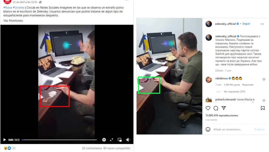 Una grabación que muestra al presidente ucraniano, Volodimir Zelenski, sentado en una mesa frente a una computadora y un polvo blanco, que los usuarios sugieren que es cocaína, ha sido compartida miles de veces en redes sociales en diferentes idiomas desde el 22 de abril de 2022. Pero el video fue manipulado para que se viera esa sustancia sobre su escritorio y no hay nada parecido en las imágenes originales, encontradas en el perfil de Instagram del mandatario.