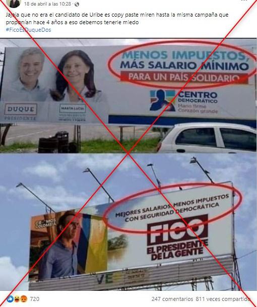 “Que no era el candidato de Uribe es copy paste miren hasta la misma campaña que proponían hace 4 años”, se lee en una de las publicaciones que difunden la supuesta valla en Facebook (1, 2), Twitter (1, 2) y sitios web (1, 2).