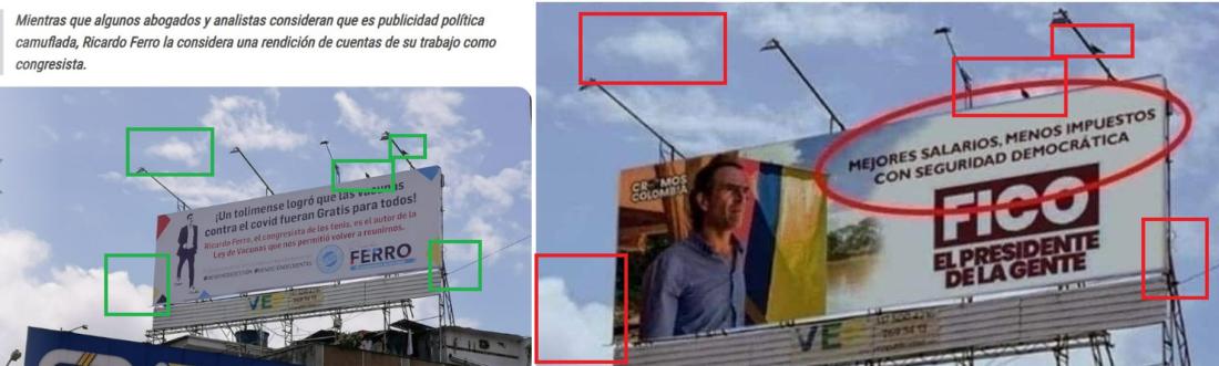Una búsqueda de la supuesta valla de Gutiérrez con Google Lens condujo a un artículo publicado por la emisora la Voz del Pueblo, de la ciudad de Ibagué (centro-occidente), en la que aparece la misma estructura de la imagen viralizada, pero con un mensaje publicitario sobre el congresista Ricardo Ferro.