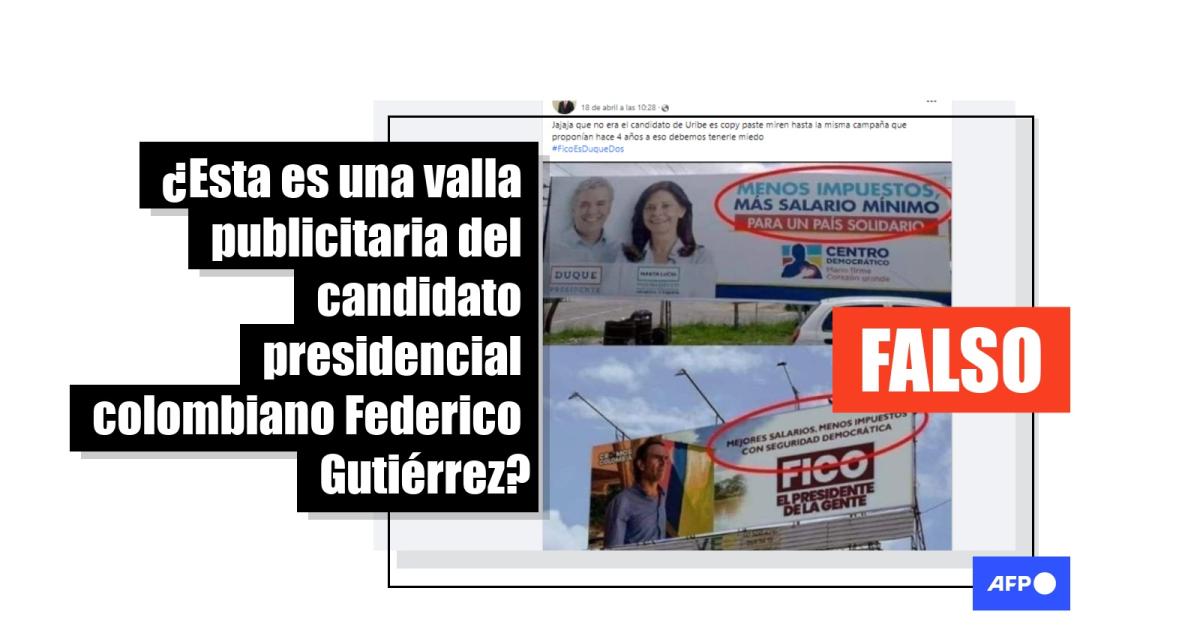 Publicaciones comparan una supuesta valla del aspirante a la Presidencia de Colombia Federico Gutiérrez que tiene el lema “mejores salarios, menos impuestos con seguridad democrática” con una publicidad de la campaña de 2018, en la que el ahora presidente, Iván Duque, promovía su candidatura con la consigna “menos impuestos, más salario mínimo para un país solidario”. El contenido ha sido compartido más de 14.000 veces en redes sociales al menos desde el 17 de abril de 2022. Pero la empresa propietaria del espacio publicitario dijo a la AFP que la supuesta propaganda de Gutiérrez es un montaje y que la estructura no tiene publicidad desde noviembre de 2021.