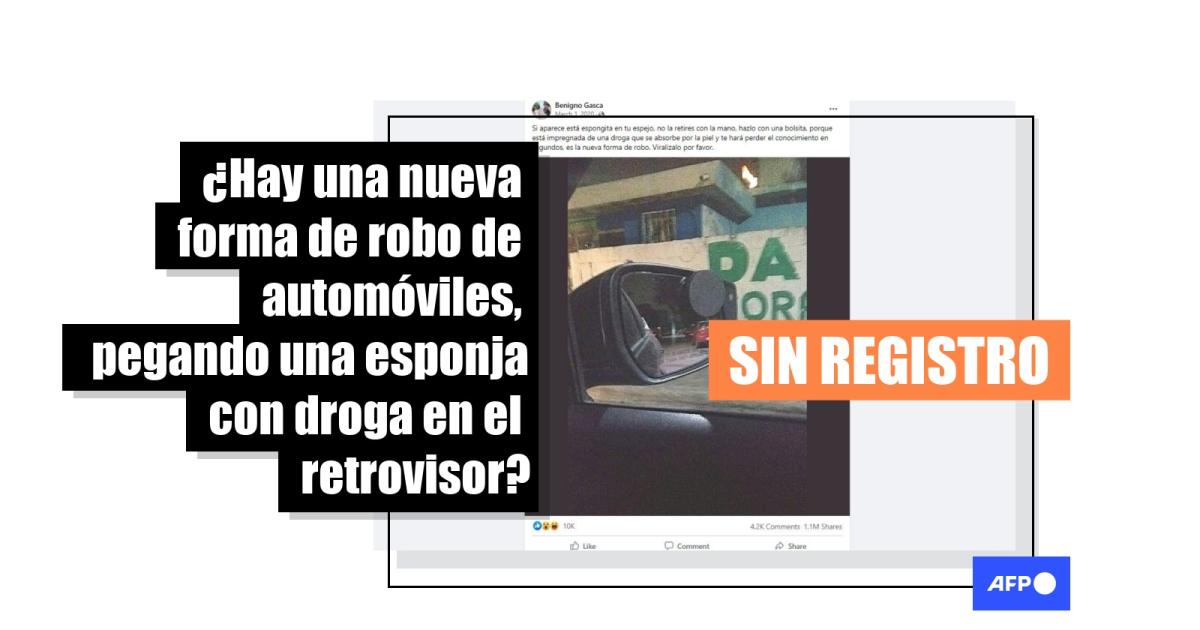 “Si aparece está espongita en tu espejo, no la retires con la mano, hazlo con una bolsita, porque está impregnada de una droga que se absorbe por la piel y te hará perder el conocimiento en segundos, es la nueva forma de robo”, dice una publicación del 1 de marzo de 2020. Otras entradas en Facebook compartieron la captura de pantalla del mismo usuario, que sigue circulando en abril de 2022.