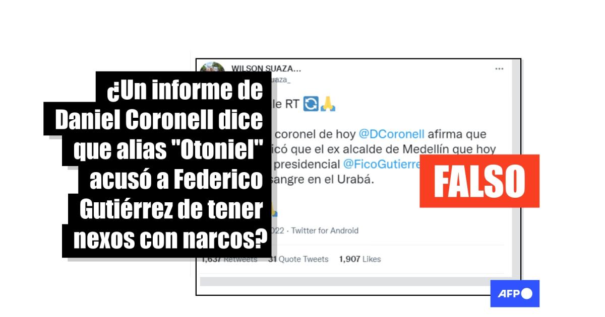 "URGENTE dale RT. En el informe coronel de hoy @DCoronell [Daniel Coronel] afirma que Otoniel testificó que el ex alcalde de Medellín que hoy es candidato presidencial @FicoGutierrez [Federico Gutiérrez] se la pasaba con alias mi sangre en el Urabá", dice el mensaje, difundido también como una captura de pantalla en Facebook (1, 2).