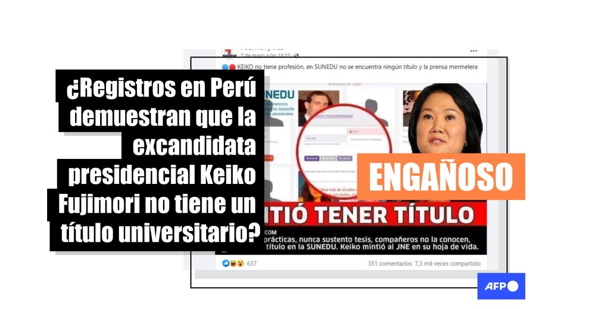 Una búsqueda realizada por la AFP en el sitio web de la Sunedu ingresando el DNI y el nombre completo de Keiko Fujimori (datos disponibles en el sitio del JNE, el Jurado Nacional Electoral de Perú) no arrojó registros de algún título universitario.
