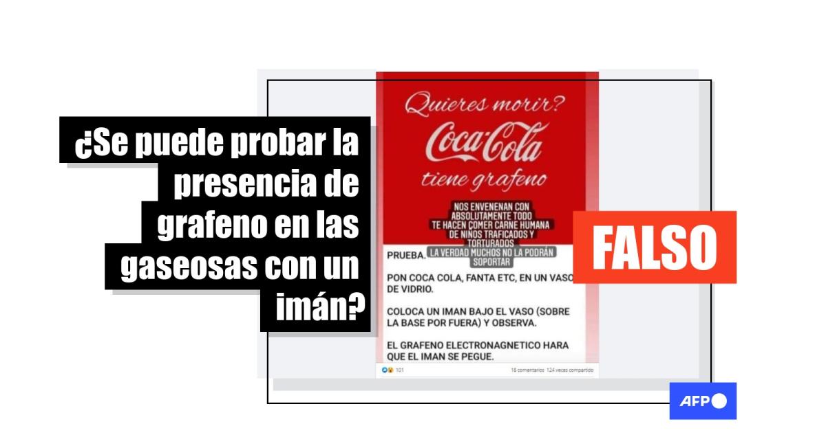 “¿Quieres morir? Coca-Cola contiene grafeno” se lee en una publicación que circula en Facebook (1, 2), diseñada con la misma tipografía y colores que la marca mencionada. “PRUEBA, PON COCA COLA, FANTA ETC, EN UN VASO DE VIDRIO”, continúa el texto. “COLOCA UN IMAN BAJO EL VASO Y OBSERVA. EL GRAFENO ELECTRONAGNETICO HARA QUE EL IMAN SE PEGUE".