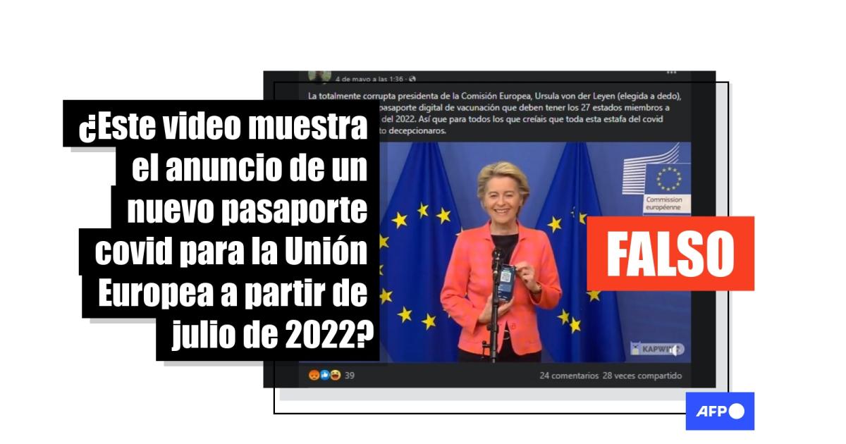 “La totalmente corrupta presidenta de la Comisión Europea, Ursula von der Leyen (elegida a dedo), Presenta el nuevo pasaporte digital de vacunación que deben tener los 27 estados miembros a partir de 1 de Julio del 2022”, señala una de las publicaciones en Facebook. Entradas similares circulan en Twitter e Instagram.
