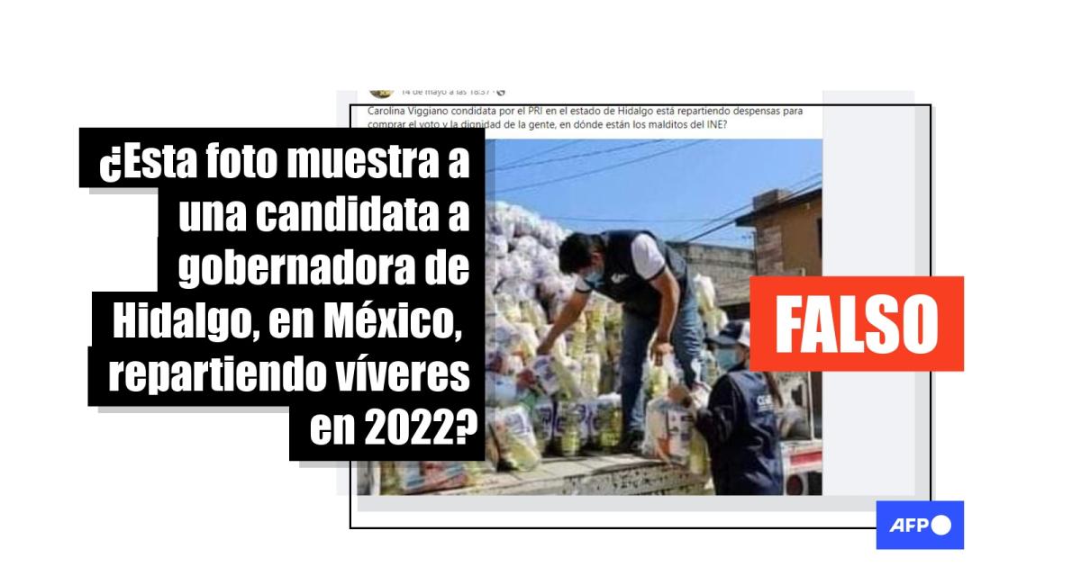 “Carolina Viggiano condidata por el PRI en el estado de Hidalgo está repartiendo despensas para comprar el voto y la dignidad de la gente, en dónde están los malditos del INE [Instituto Nacional Electoral]?”, dice una de las publicaciones en Facebook (1, 2) y Twitter.