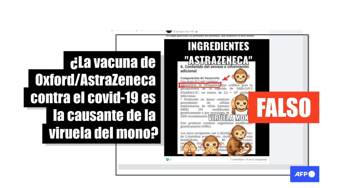 La afirmación circula en Facebook (1, 2), Twitter (1, 2) y Telegram (1, 2). De acuerdo con los usuarios que la comparten, el adenovirus de chimpancé que forma parte de los componentes de la vacuna de Oxford/AstraZeneca es el causante de la viruela del mono.