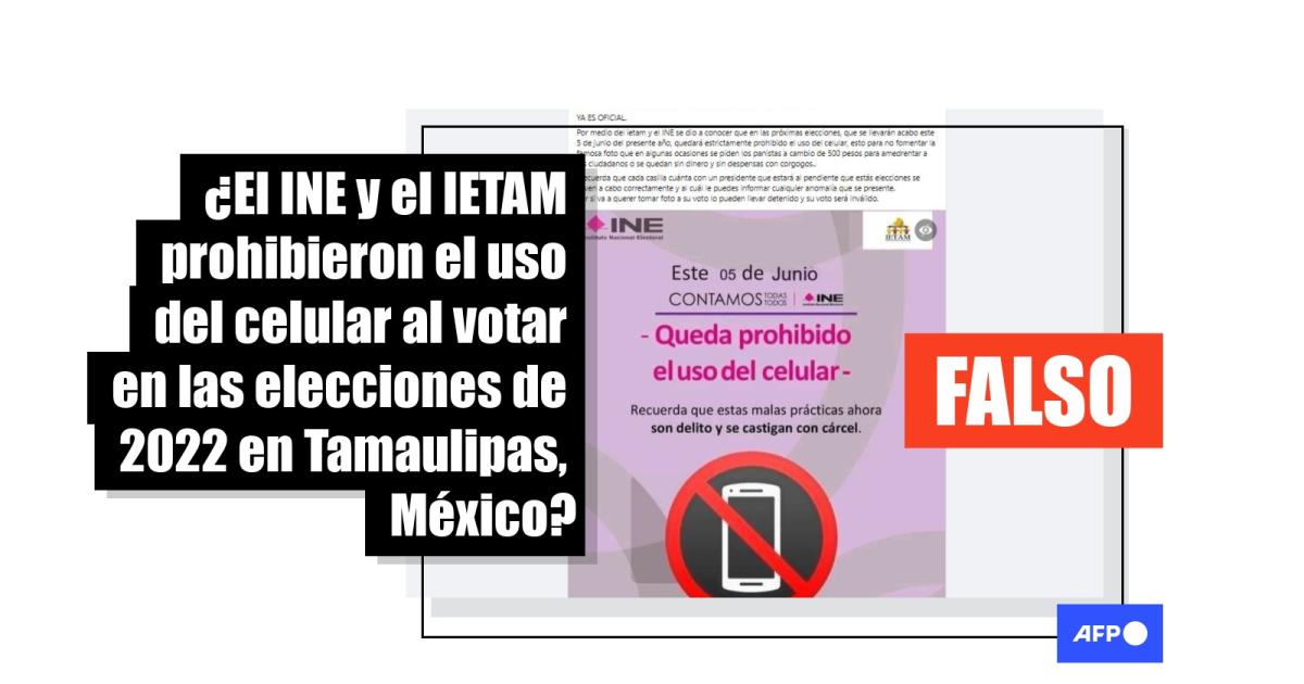 “Por medio del ietam y el INE se dio a conocer que en las próximas elecciones, que se llevarán acabo este 5 de junio del presente año, quedará estrictamente prohibido el uso del celular”, dicen publicaciones en Facebook (1, 2, 3) con la imagen.