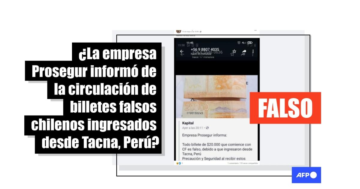“Empresa Prosegur informa: Todo billete de $20.000 que comience con CF es falso, debido a que ingresaron desde Tacna, Perú Precaución y Seguridad al recibir estos billetes que ya andan circulando por todo nuestro país en el comercio”, se lee en las entradas en Facebook (1, 2) que muestran una fotografía de dos billetes de 20.000 pesos chilenos iniciados con las letras CF en la marca de serie.