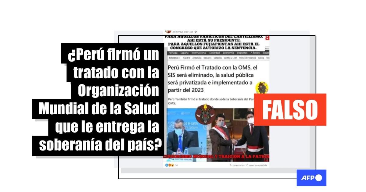 Consultado por la AFP, la dirección de comunicaciones del Ministerio de Salud de Perú señaló que es falso que se firmó un tratado con la OMS que implique la pérdida de soberanía y la eliminación del SIS. “No se firmó ningún tipo de tratado con la OMS”, dijo.