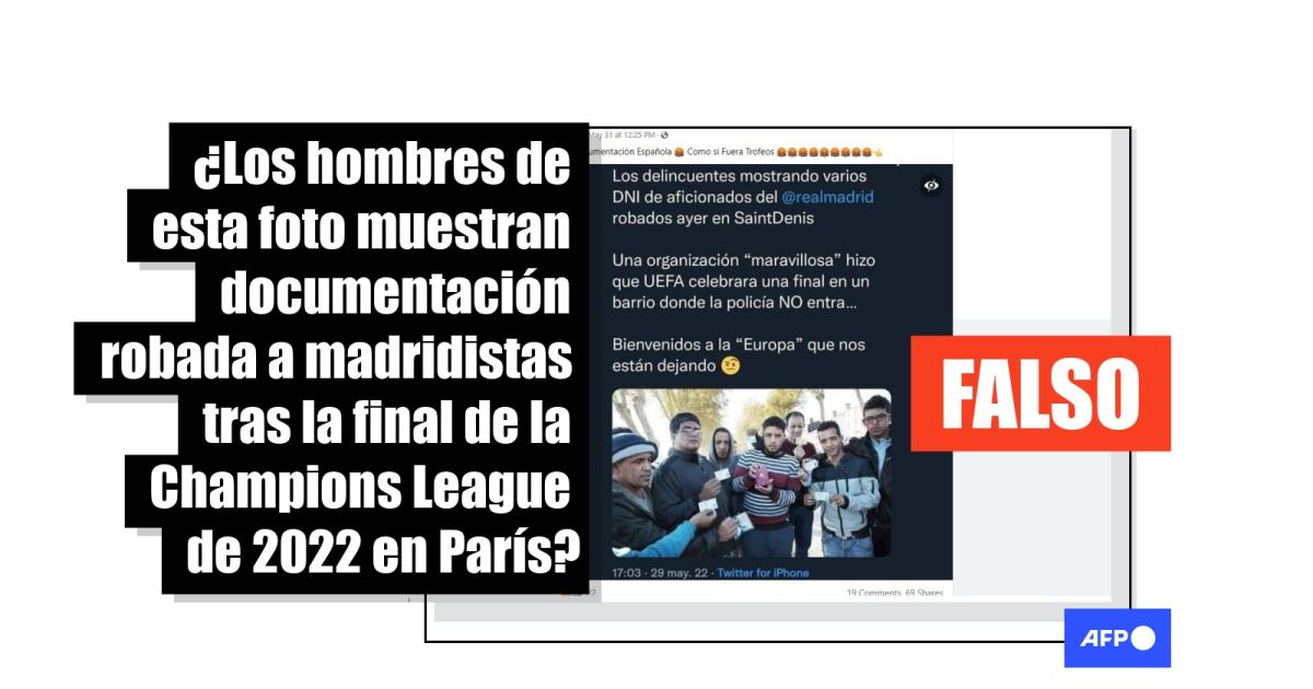 “Los delincuentes mostrando varios DNI de aficionados del @realmadrid robados ayer en SaintDenis”, comienza el mensaje compartido en Facebook. La fotografía también fue publicada por un medio digital en un artículo sobre el caos generado tras la final de la Champions League en París, sobre el que se expresó incluso el presidente francés, Emmanuel Macron. El encuentro se disputó el 28 de mayo en el Stade de France, situado en Saint-Denis, al norte de París.