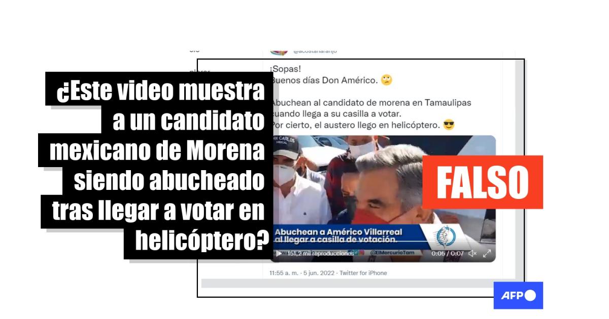 “Sopas! Buenos días Don Américo. Abuchean al candidato de morena en Tamaulipas cuando llega a su casilla a votar. Por cierto, el austero llego en helicóptero”, dice una de las publicaciones que difunden la secuencia en Twitter (1, 2), Facebook (1, 2), YouTube y un artículo (1).