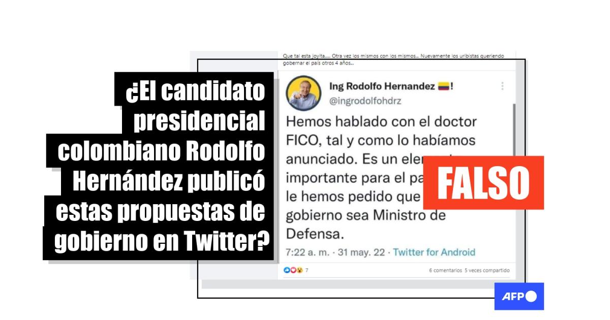 Consultada por AFP Factual, Luisa Olejua, directora de comunicaciones de Hernández, dijo que los tres tuits atribuidos al candidato son “falsos”.