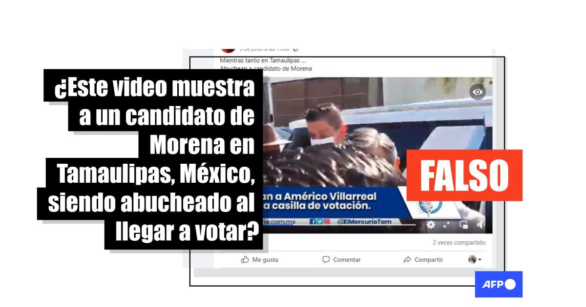 El video de siete segundos incluye un cintillo donde se atribuye la publicación al periódico local El Mercurio de Tamaulipas y donde se lee: “Abuchean a Américo Villareal al llegar a casilla de votación”. En la secuencia se escuchan gritos de “Fuera Morena”.